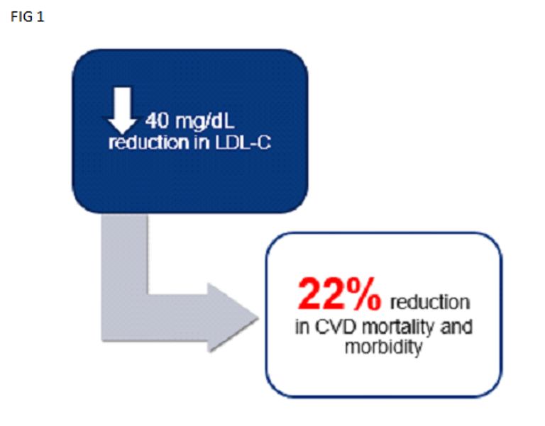 Improved Cardiovascular Outcome is seen with a drop in LDL-C levels. As an established example, a reduction of 40 mg/dL in LDL-C leads to 22% reduction in Cardio Vascular Disease mortality and morbidity (figure 1). Improving your good cholesterol levels HDL-C may also have the same good heart disease reduction effect (Figure 2).